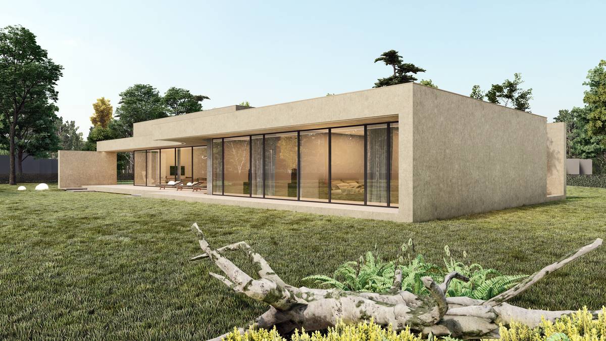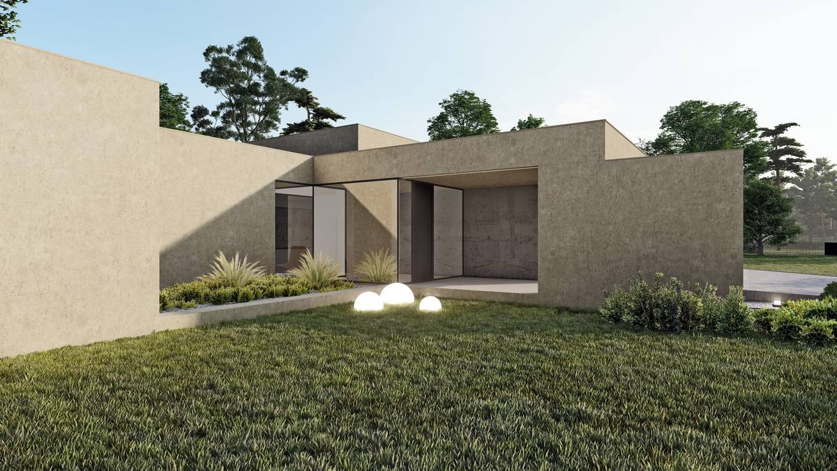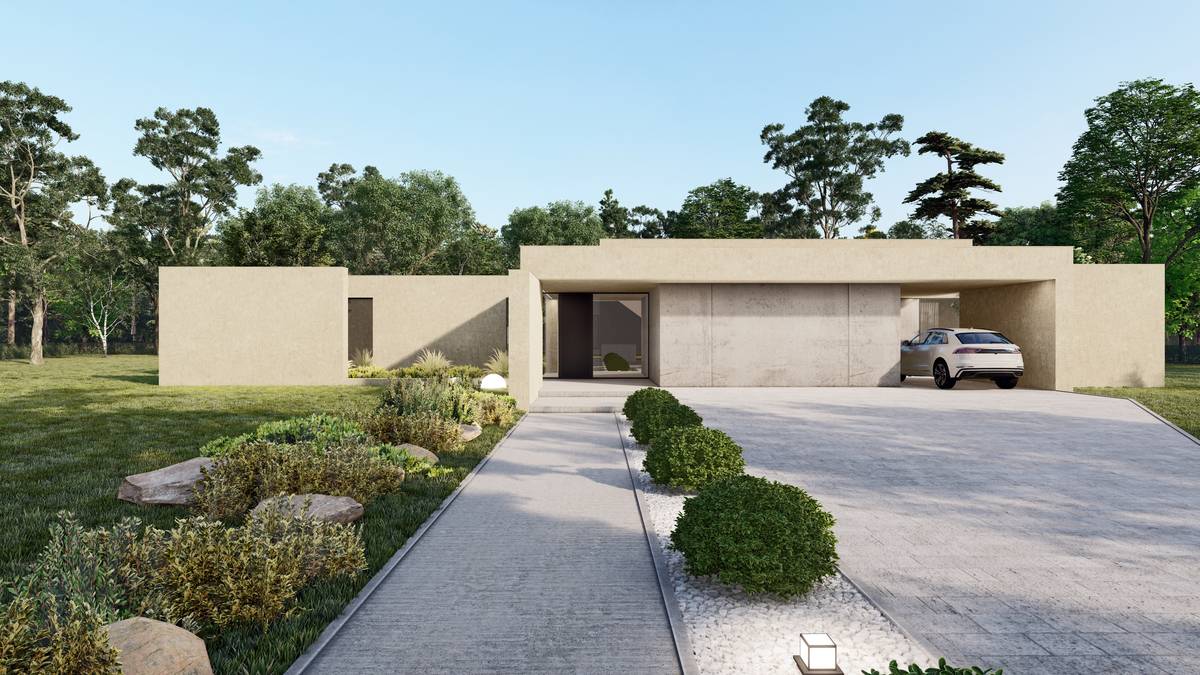 Bryła budynku zachwyca harmonią i prostotą. Ciepły, spatynowany tynk w piaskowym odcieniu, pokrywający całą konstrukcję, nadaje jej śródziemnomorski charakter. Kontrastujące, szare podcienia dodają elegancji i podkreślają unikalny design.