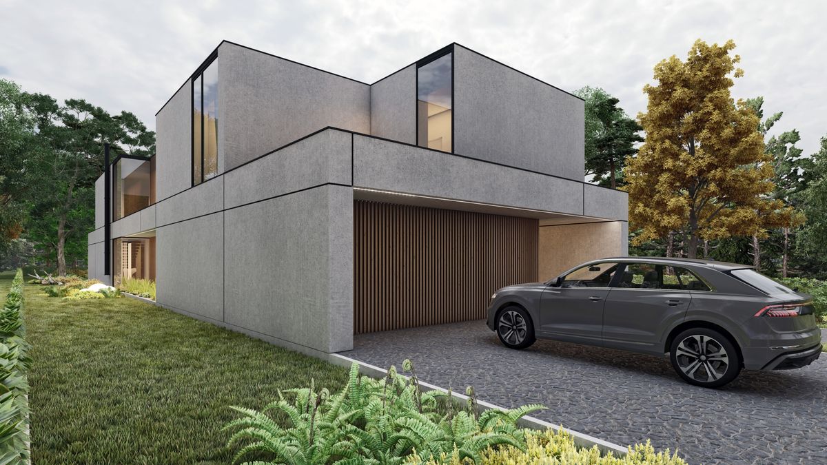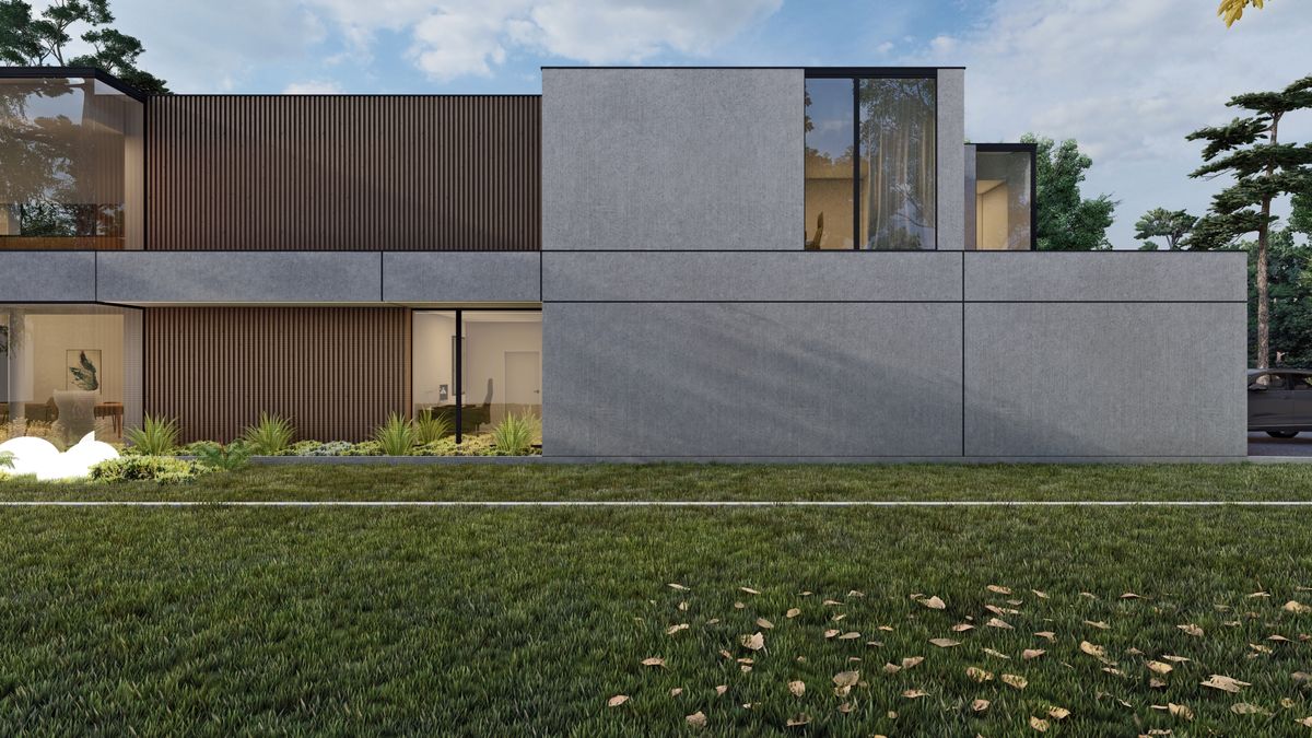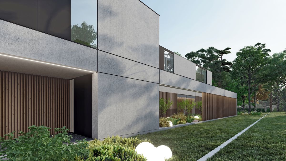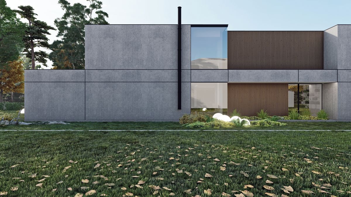 Motywem przewodnim na elewacjach stał się betonowy tynk strukturalny, który w połączeniu z pasami boniowania sprawia, że Dom na Długo wygląda jakby skonstruowany był z wielkich, betonowych bloków tworzących ściany i stropy. Aby wizualnie ocieplić odważną i surową bryłę budynku, zastosowane zostały lamele kompozytowe, które pojawiają się we wszystkich podcieniach oraz stanowią ażurową przesłonę zapewniającą prywatność dla strefy dziennej i tarasu.
