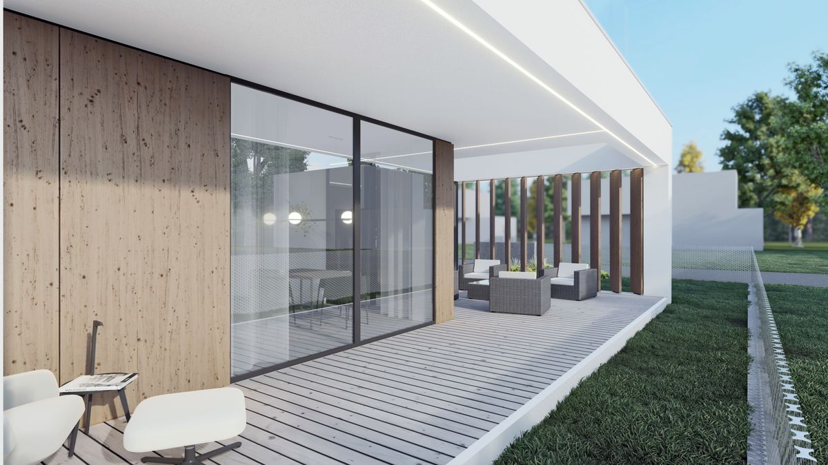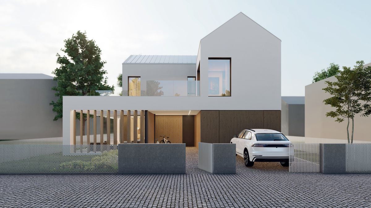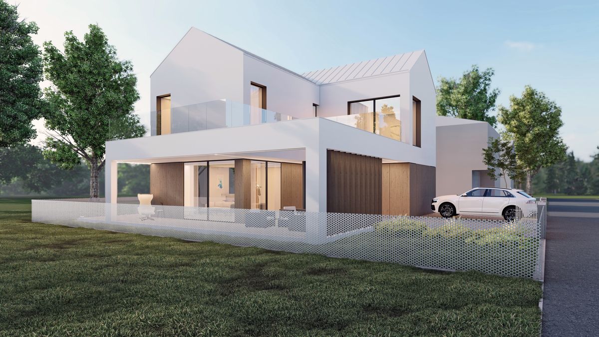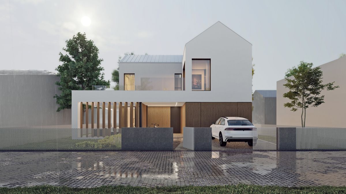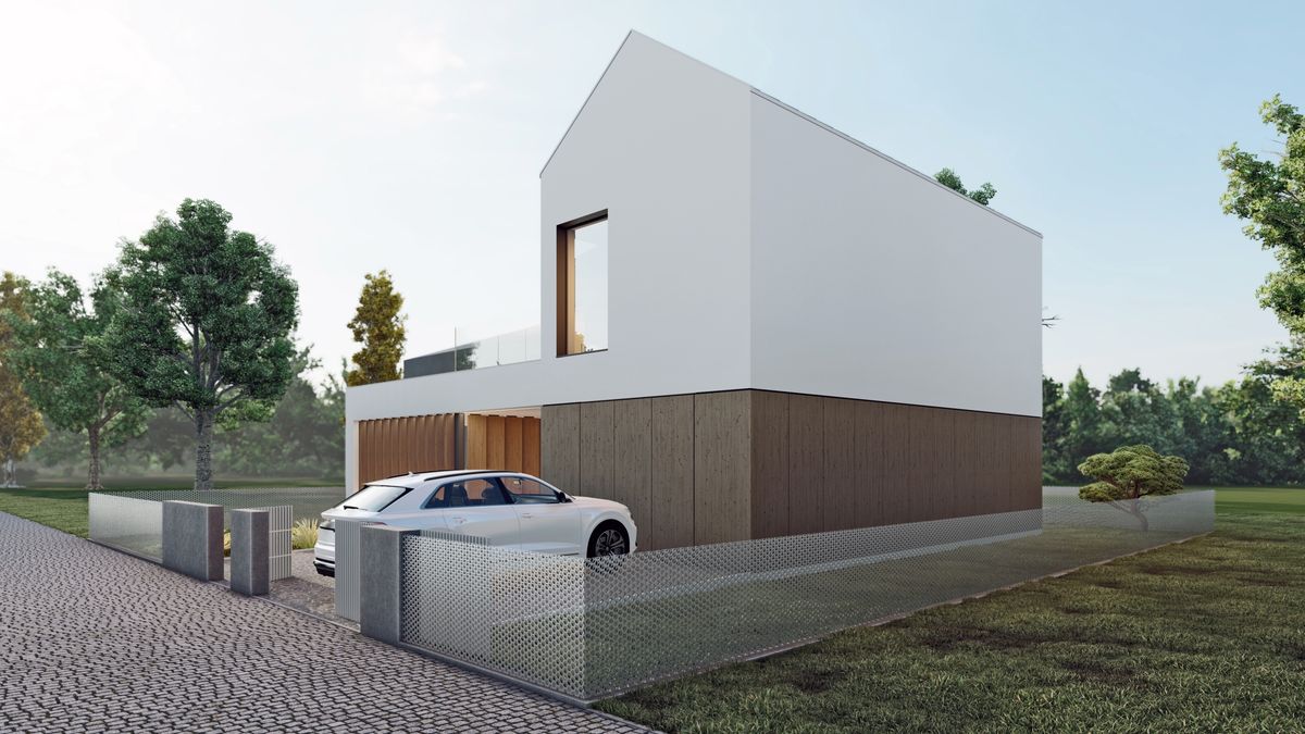 Dom na Ramie to projekt nowoczesnego, kompaktowego domu, który zaprojektowany został w Warszawie. Ogromnym wyzwaniem podczas prac nad projektem była niewielka działka o powierzchni zaledwie 400m2 oraz bardzo restrykcyjne zapisy decyzji o warunkach zabudowy. Natomiast nasz cel oraz wymaganie Klientów stanowiło osiągnięcie minimalistycznej, prostej formy budynku o pełnej funkcjonalności. Dom powstał na planie litery L, co umożliwiło cofnięcie jednego ze skrzydeł i otworzenie się na południową ekspozycję dla części dziennej budynku. Parter zajęły pomieszczenia strefy dziennej, gabinet oraz garaż. Piętro natomiast to w całości strefa nocna z trzema sypialniami, dwiema łazienkami oraz garderobą i pralnią.