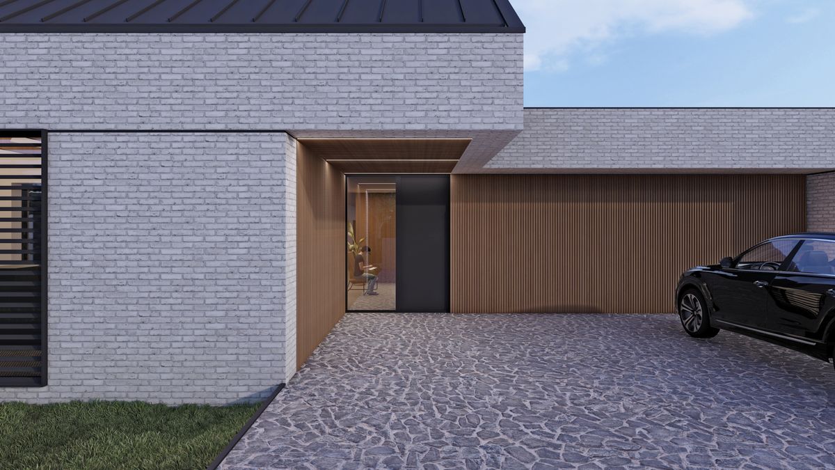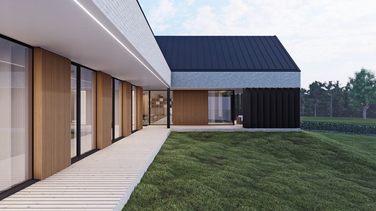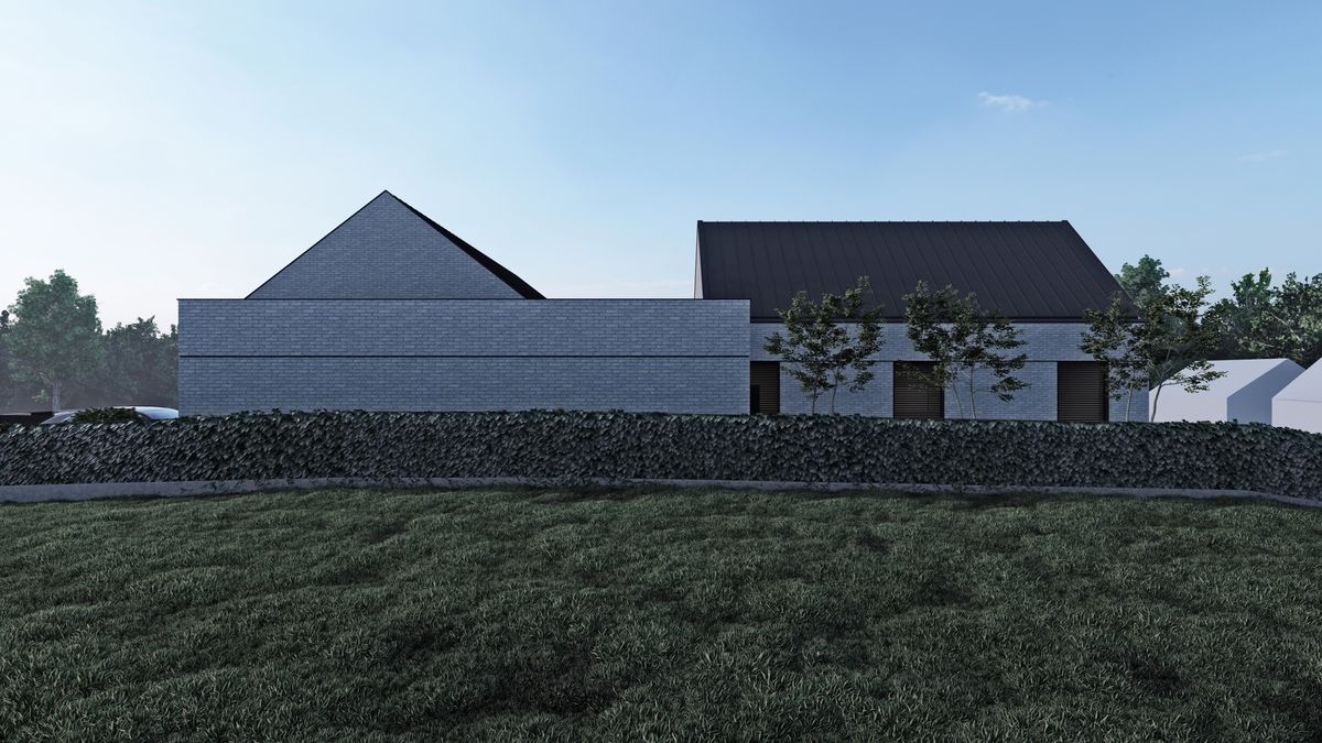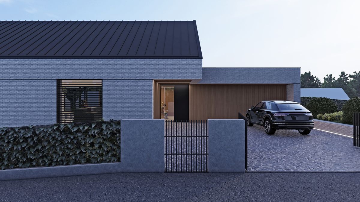 Od strony północno-wschodniej jako bufor pomiędzy skrzydłem techniczno-garażowym a sypialnym zaprojektowany został zielony dziedziniec z roślinami oraz drzewami ozdobnymi. Całości kompozycji dopełnia rozległy, taras łączący strefę dzienną oraz strefę prywatną pozwalający pod zadaszeniem poruszać się pomiędzy obiema bryłami. Na elewacjach dominuje ponadczasowa cegła o szarostalowym odcieniu oraz drewniane panele ryflowane znajdujące się we wszystkich podcieniach domu. Ustawione w taki sposób aby przepuszczać światło, jednocześnie zapewniając prywatność w pomieszczeniach i na głównym tarasie.