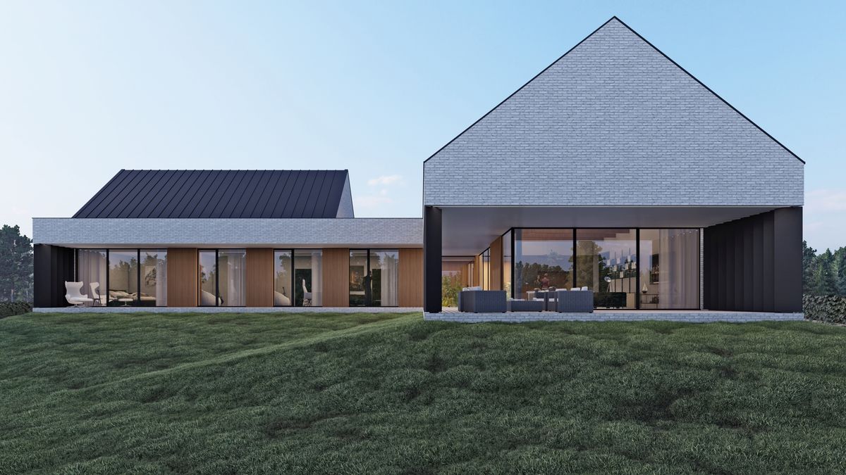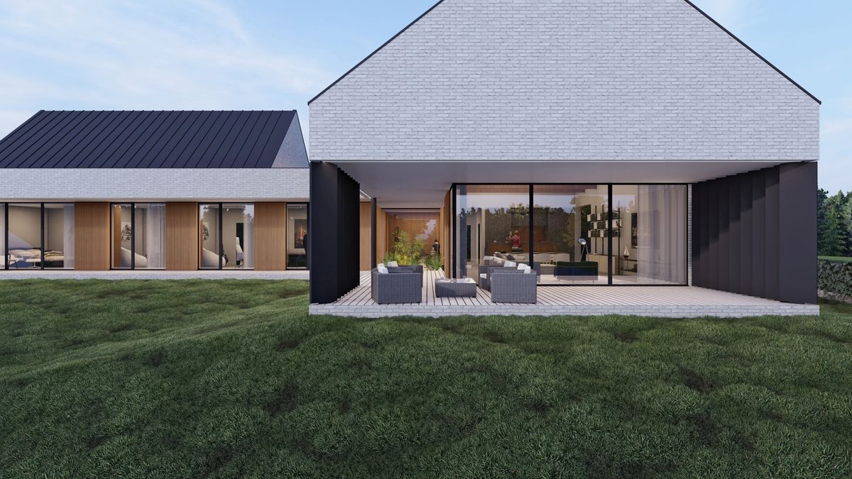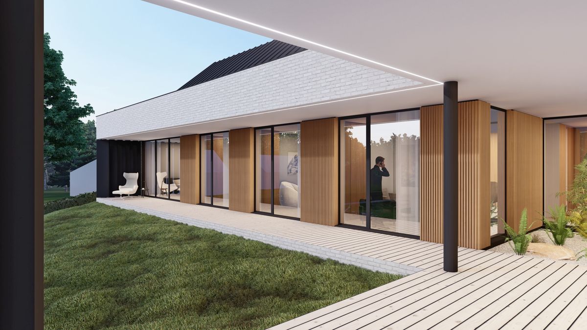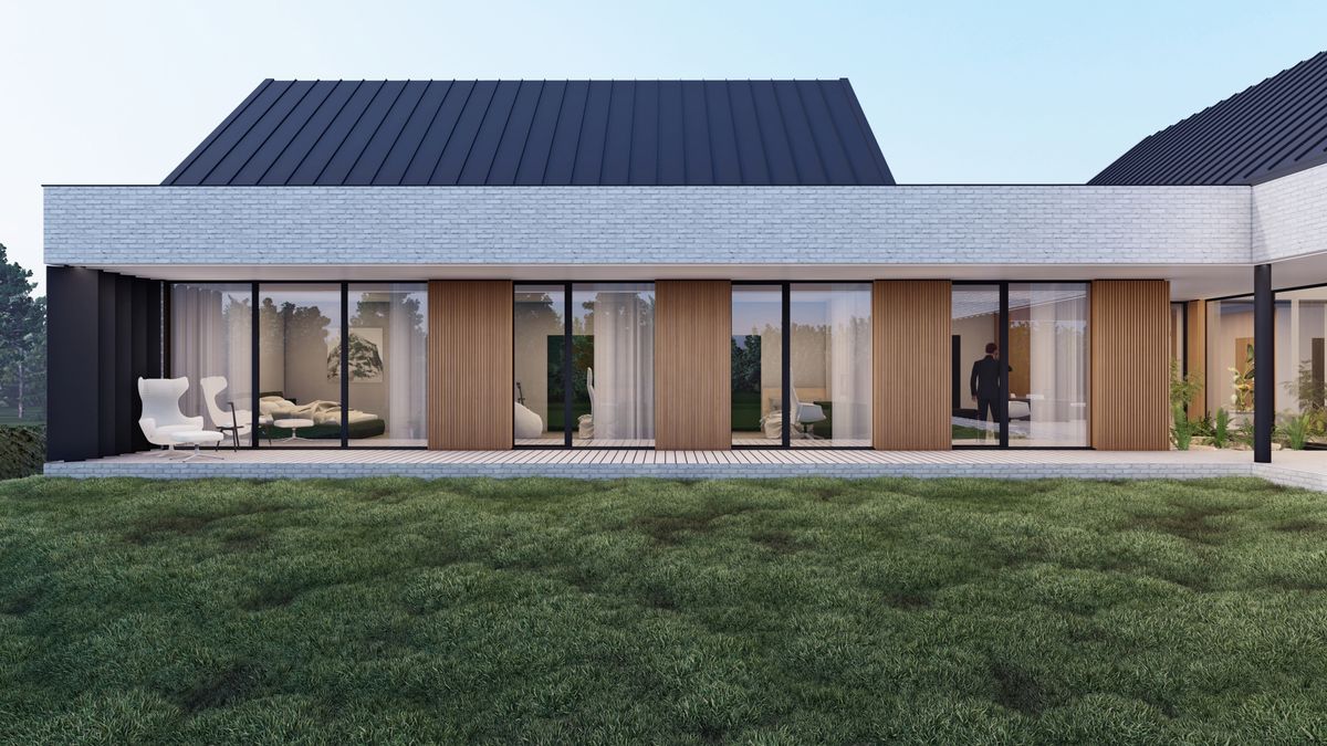 Od strony północno-wschodniej jako bufor pomiędzy skrzydłem techniczno-garażowym a sypialnym zaprojektowany został zielony dziedziniec z roślinami oraz drzewami ozdobnymi. Całości kompozycji dopełnia rozległy, taras łączący strefę dzienną oraz strefę prywatną pozwalający pod zadaszeniem poruszać się pomiędzy obiema bryłami. Na elewacjach dominuje ponadczasowa cegła o szarostalowym odcieniu oraz drewniane panele ryflowane znajdujące się we wszystkich podcieniach domu. Ustawione w taki sposób aby przepuszczać światło, jednocześnie zapewniając prywatność w pomieszczeniach i na głównym tarasie.