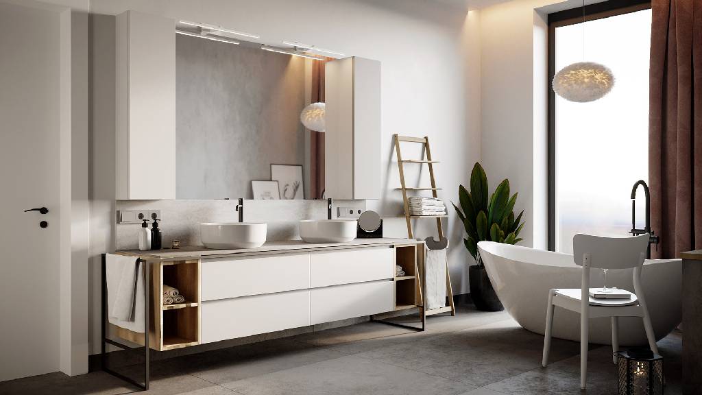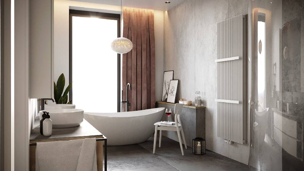 Projekt Domu „L” pod Warszawą zakładał oprócz projektu architektonicznego również projekt wykonawczy kilku kluczowych pomieszczeń.Do takich pomieszczeń zaliczała się między innymi łazienka w strefie master. Zgodnie z wymaganiami Inwestorów zaprojektowana została ona jako przestronny i prestiżowy salon kąpielowy. Elementem, który skupia na sobie całą uwagę jest designerska, wolnostojąca wanna, która usytuowana jest w taki sposób, że zapewnia jednocześnie widok na krajobraz za oknem jak również odpowiednią dozę prywatności. Jeśli ów prywatności jest jednak za mało mamy do dyspozycji zasłony w ciekawym, ceglastym kolorze. Ważnym rozwiązaniem funkcjonalnym są dwie umywalki nablatowe zapewniające Inwestorom bardziej komfortowe i sprawne korzystanie z łazienki. Ciekawym akcentem jest również lampa znajdująca się nad wanną wykonana z naturalnych piór.