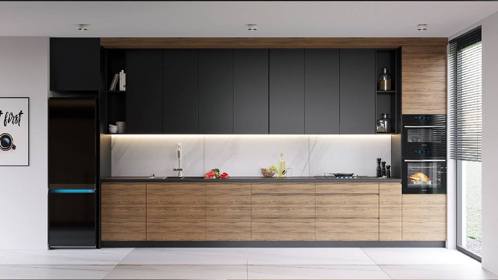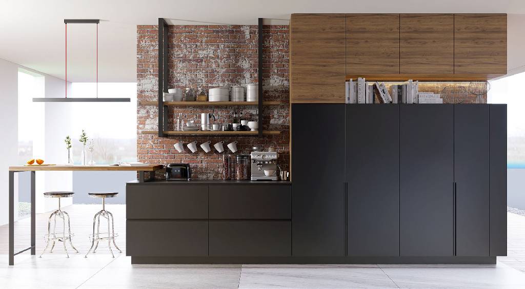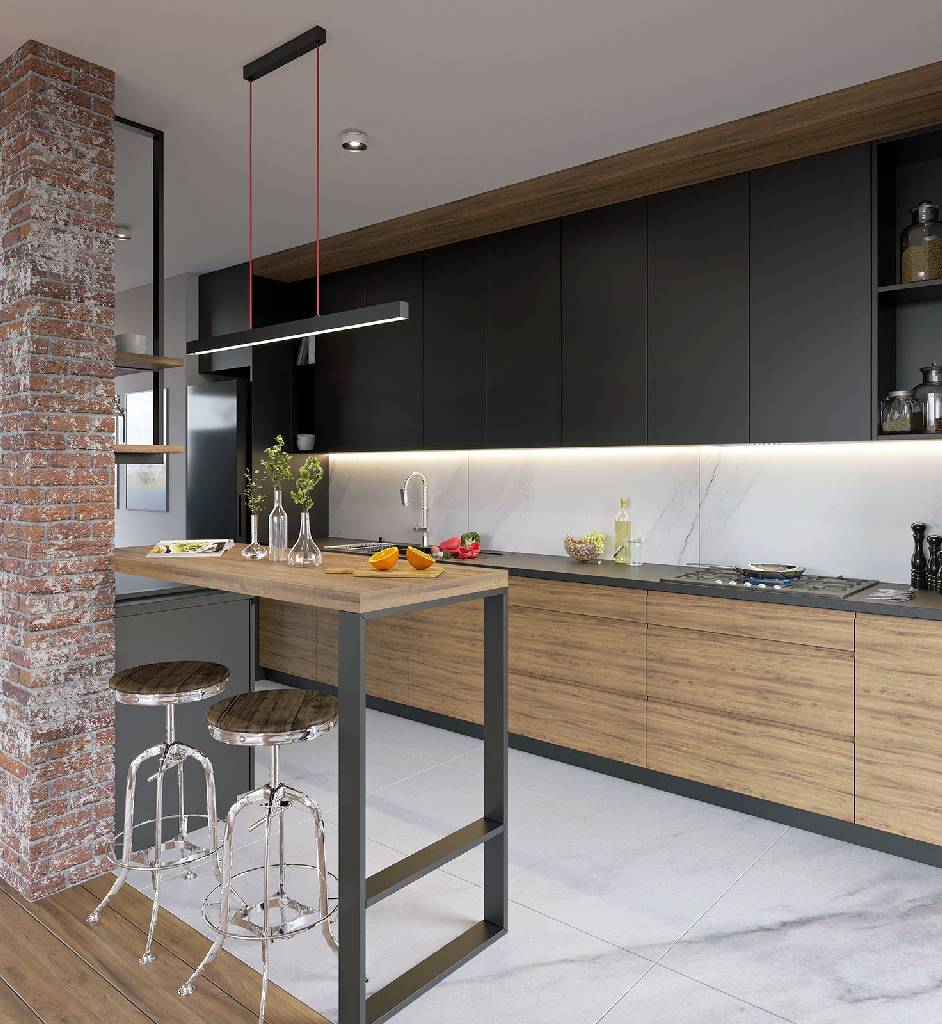 Drugim zaprojektowanym kompleksowo pomieszczeniem jest półotwarta kuchnia.Stanowi ona pomieszczenie przejściowe, dostępne zarówno od strony salonu jak i głównej komunikacji w domu. Wydzielona została za pomocą ściany będącej elementem nośnym dla schodów wspornikowych w salonie – z możliwością obejścia z obu stron. Na wspomnianej ścianie od strony kuchni zaprojektowana została wysoka zabudowa przeznaczona do przechowywania. Znajduje się tam również kącik kawowy oraz blat barowy z hokerami – otwarty na salon. Druga strona kuchni przeznaczona jest na sprzęty kuchenne w zabudowie oraz miejsce do przygotowywania posiłków. Przestrzeń kuchni zaprojektowana została wykorzystując czerń oraz ciemne drewno uzupełnione motywem surowej cegły co idealnie współgra z bardzo przeszklonym, jasnym salonem.