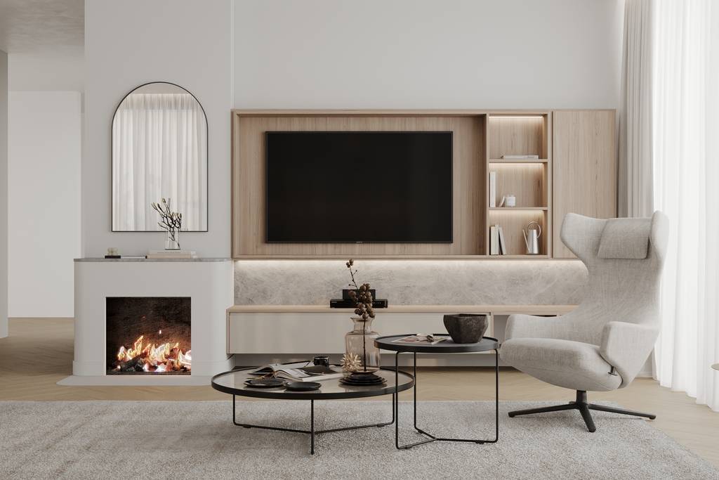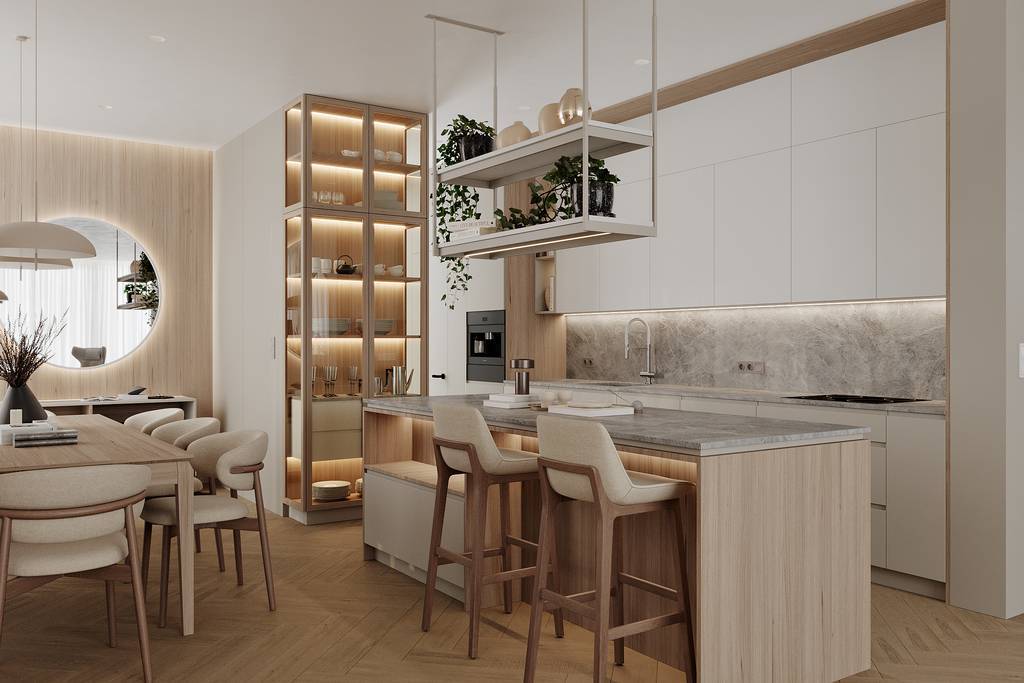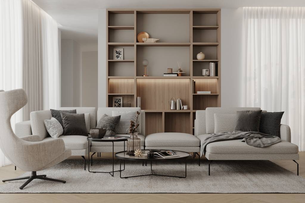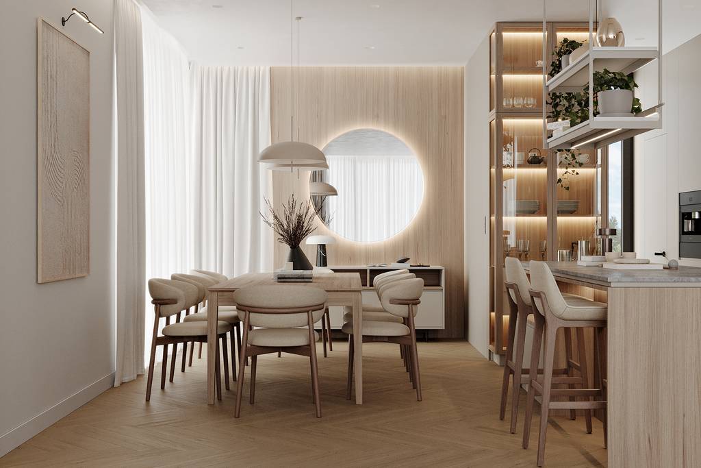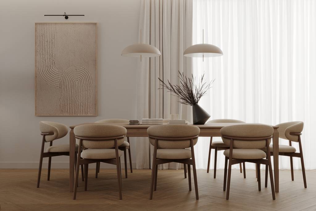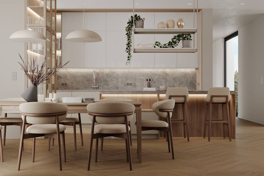 Projekt wnętrz Domu na Trzy podporządkowany został bardzo stonowanej stylistyce, dającej poczucie domowego ciepła. Dominującym kolorem został beż, występujący w formie zróżnicowanych faktur i odcieni. Pojawia się on przede wszystkim na ścianach, tekstyliach oraz frontach meblowych. Uzupełniony jest on znaczną ilością elementów z naturalnego, jasnego drewna w formie wyposażenia meblowego, elementów stolarskich oraz okładzin ściennych.