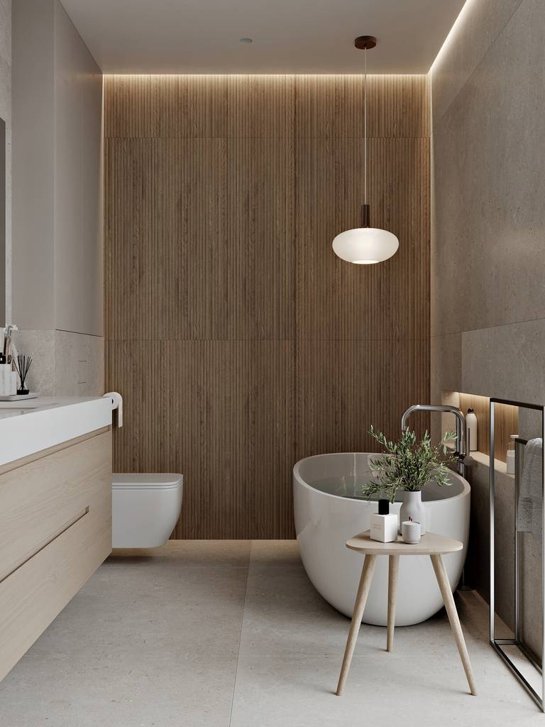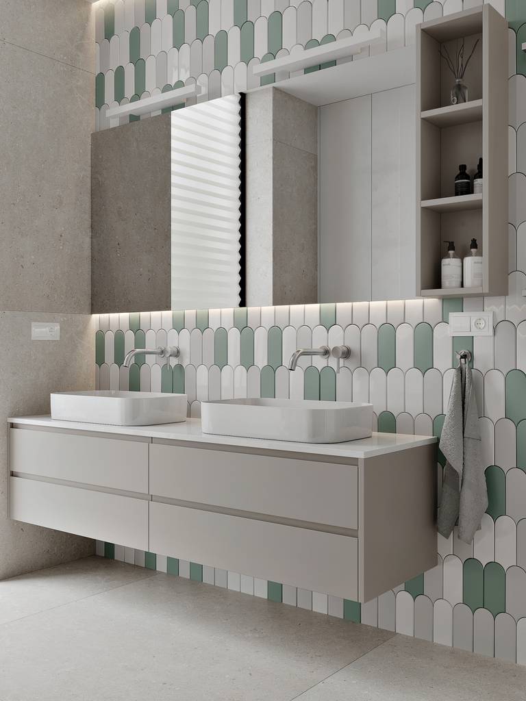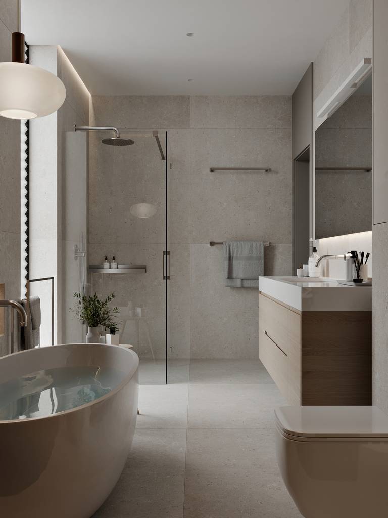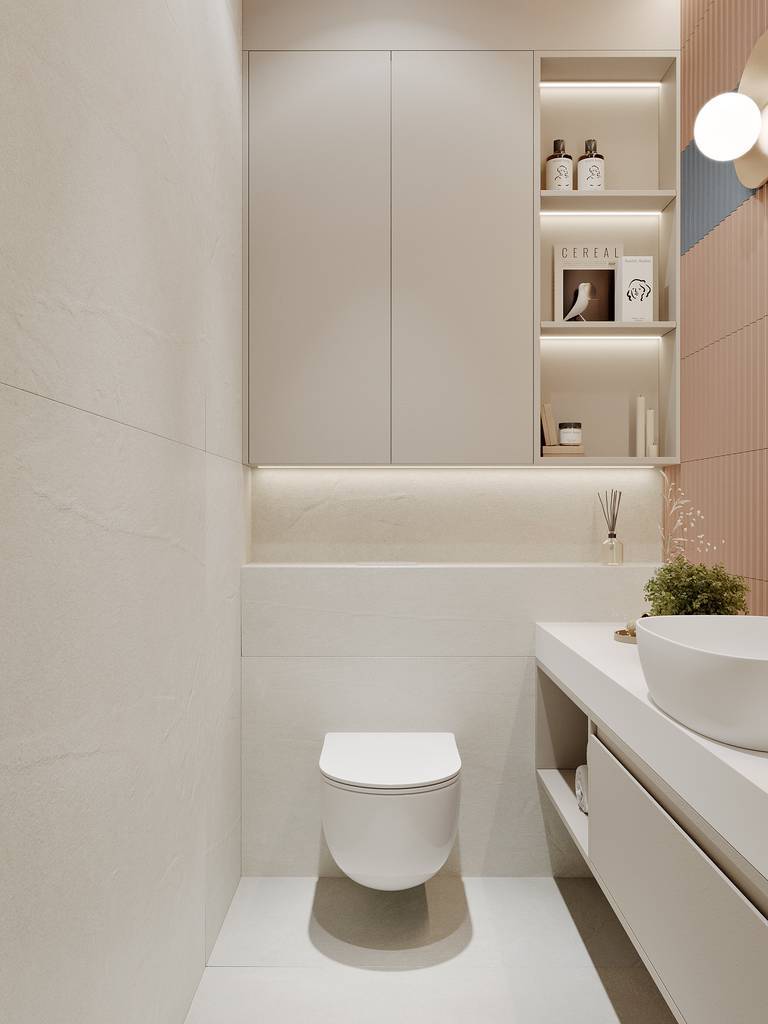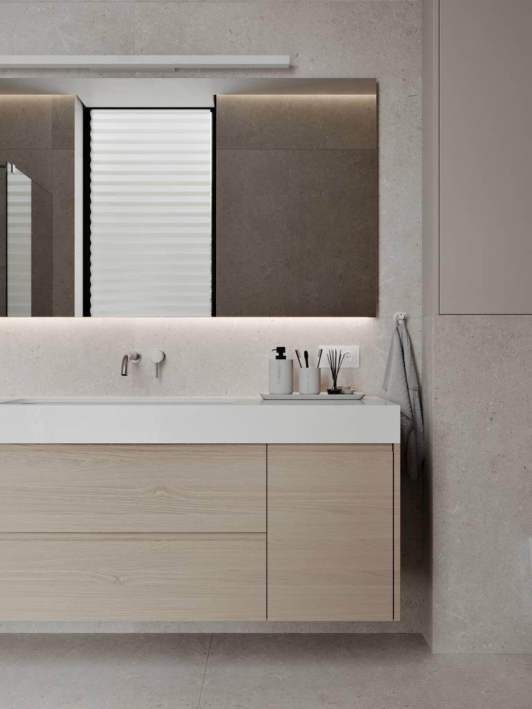 Powyższe rozwiązania kontynuowane są w pomieszczeniach prywatnych, takich jak łazienki. Jest to wyraźnie widoczne zwłaszcza w łazience master, będących konsekwentną kontynuacją designu strefy dziennej. Pewne odstępstwo od tej normy stanowią łazienka w strefie dziennej oraz łazienka dzieci. W obu z nich wprowadzony został dodatkowy element w postaci bardzo wyrazistego, pastelowego koloru w formie płytek dekoracyjnych.
