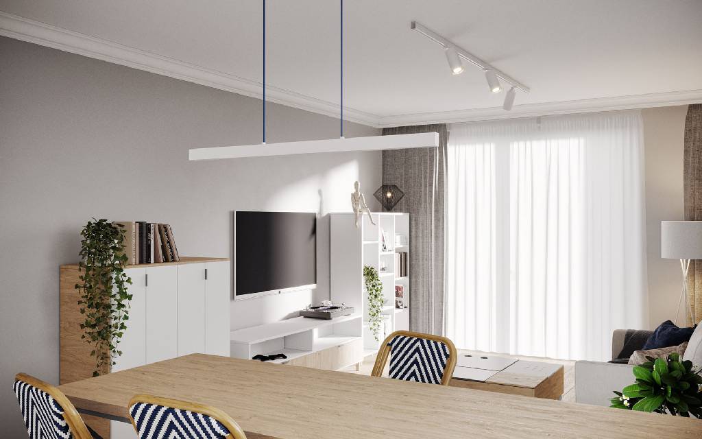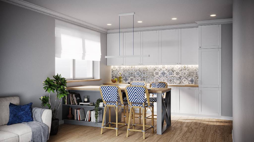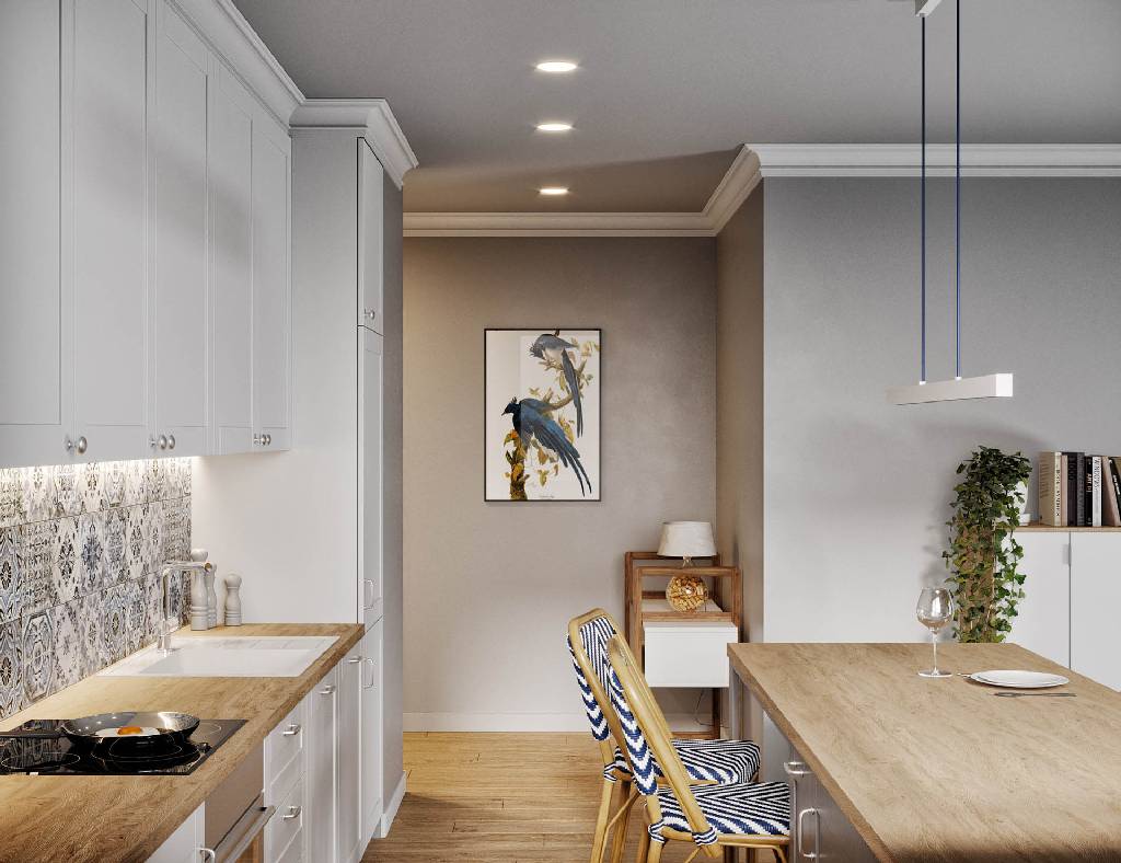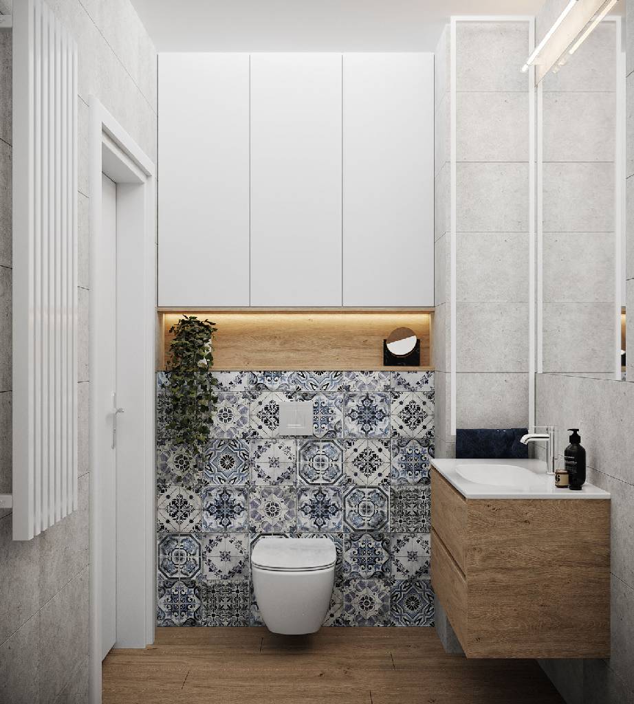Elementy klasyczne zbalansowane zostały nowoczesnymi meblami oraz minimalistycznymi oprawami oświetleniowymi. Akcentem, który przejawia się w wielu miejscach wnętrza jest motyw koloru niebieskiego np.: na płytkach, obrazie czy obiciach meblowych.
